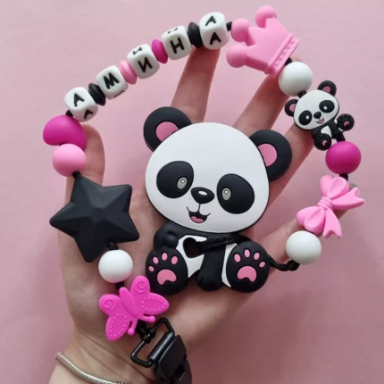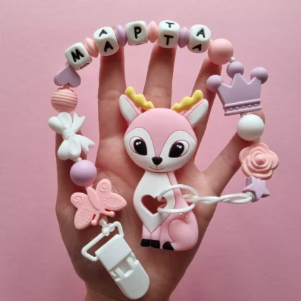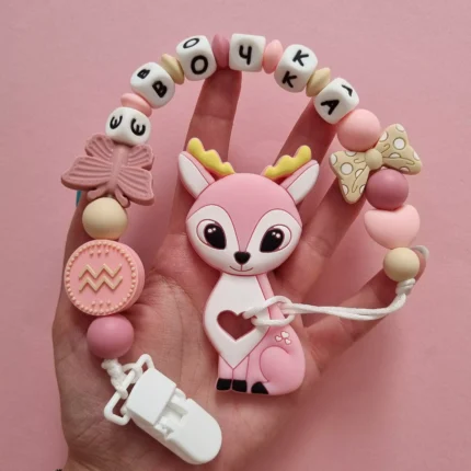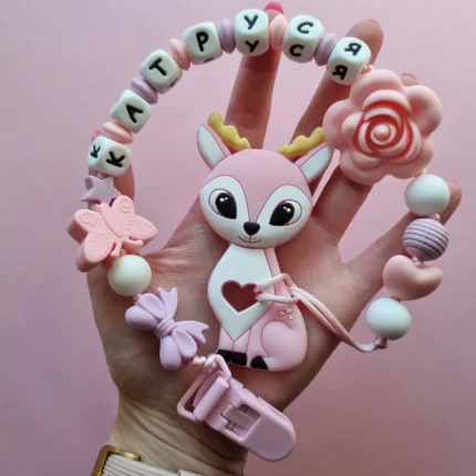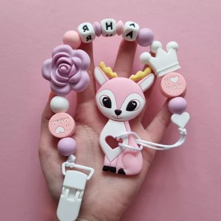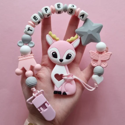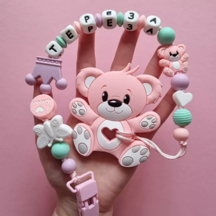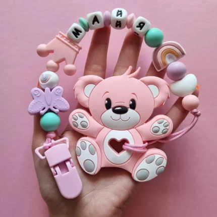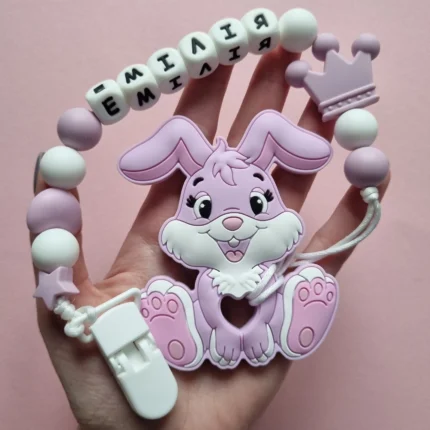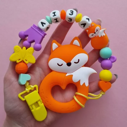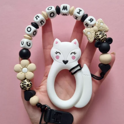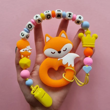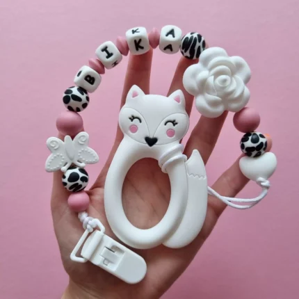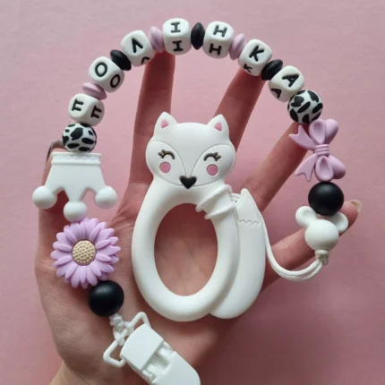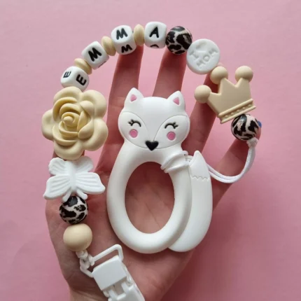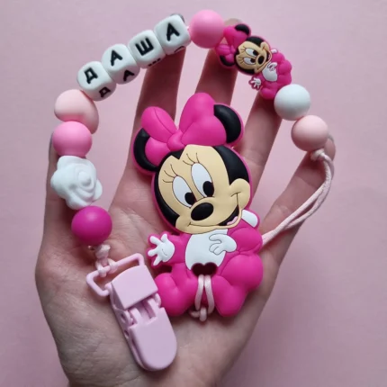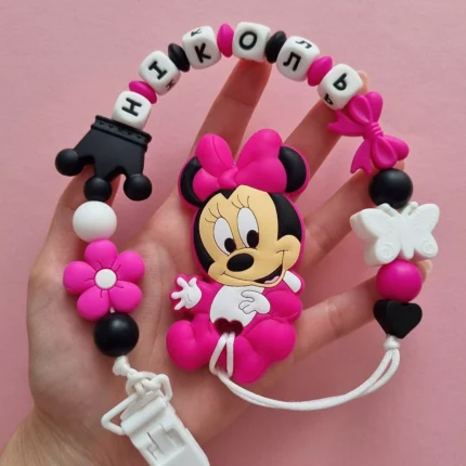 Дитячий гризунець із харчового силікону у вигляді чарівної Мінні Маус — ідеальний помічник для малюків під час прорізування зубів. Мінні Маус завжди залишається головним елементом, додаючи чарівності, тоді як бусини та декоративні елементи можуть змінюватися за вашим бажанням. Це дозволяє створити унікальний дизайн для кожної дитини. Всі деталі виготовлені з безпечного харчового силікону, який не містить шкідливих речовин і чудово підходить для заспокоєння ясен під час прорізування зубів. Персоналізований напис робить гризунець не тільки корисним, а й модним аксесуаром для вашої дитини.