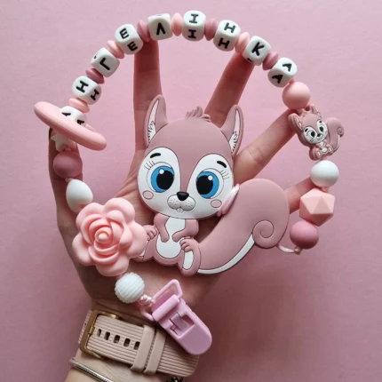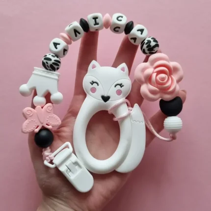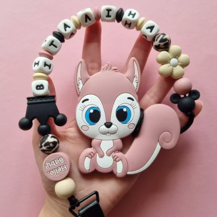 Чарівний дитячий гризунець із харчового силікону у вигляді панди— чудовий супутник для вашого малюка під час прорізування зубів. М’яка текстура силікону дбайливо масажує ясна, допомагаючи полегшити біль. Головним елементом цього гризунця є мила пандочка, яка викликає посмішку у дітей. Ви можете обрати бусини та декоративні елементи на свій смак, щоб створити унікальний аксесуар для вашого малюка. Всі деталі виготовлені з безпечного, нетоксичного матеріалу, що відповідає найвищим стандартам якості. Іменна персоналізація додає особливої індивідуальності, роблячи цей гризунець ідеальним подарунком.