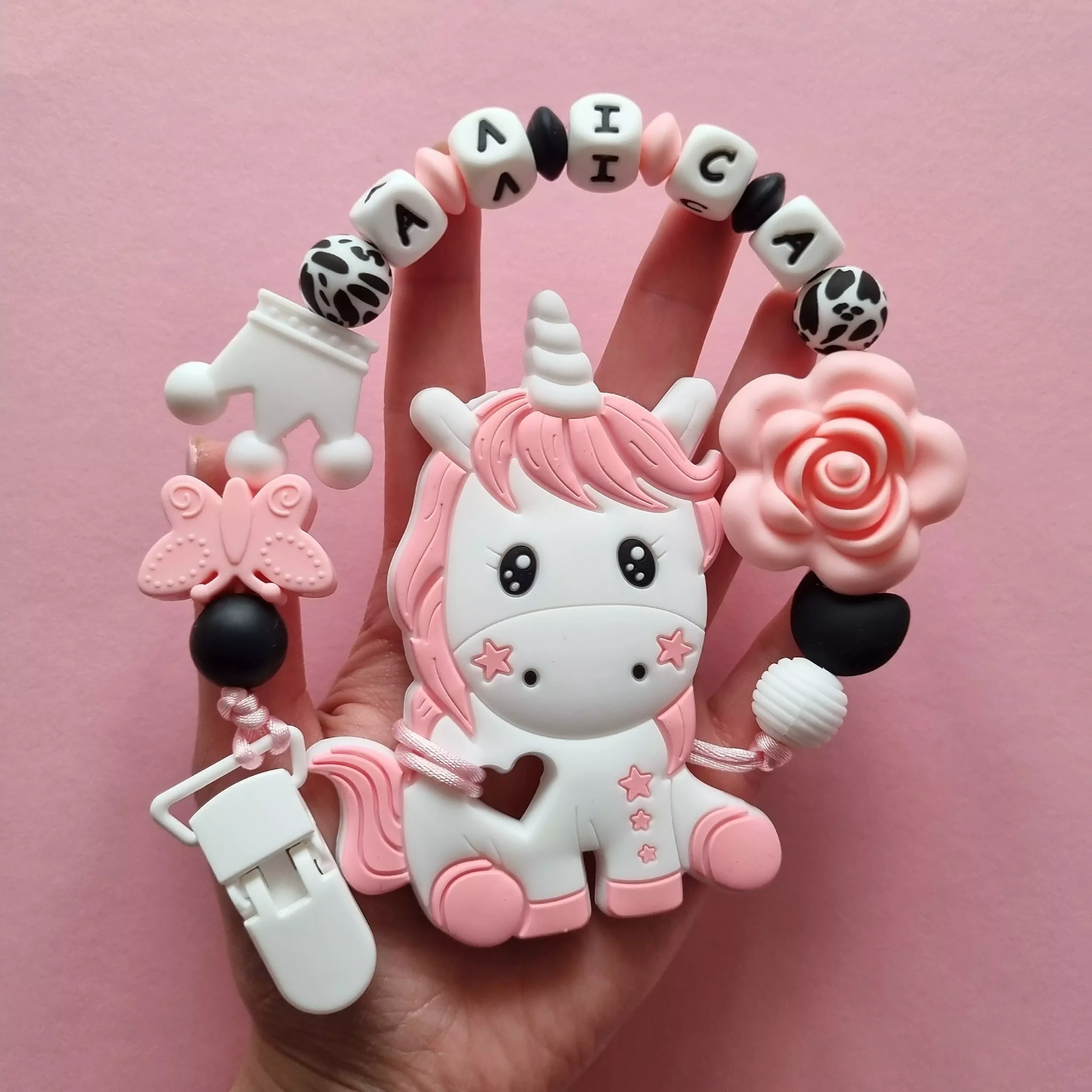 Чарівний дитячий гризунець із харчового силікону у вигляді єдинорога— чудовий супутник для вашого малюка під час прорізування зубів. М’яка текстура силікону дбайливо масажує ясна, допомагаючи полегшити біль. Головним елементом цього гризунця є милий єдинорожок, який викликає посмішку у дітей. Ви можете обрати бусини та декоративні елементи на свій смак, щоб створити унікальний аксесуар для вашого малюка. Всі деталі виготовлені з безпечного, нетоксичного матеріалу, що відповідає найвищим стандартам якості. Іменна персоналізація додає особливої індивідуальності, роблячи цей гризунець ідеальним подарунком.