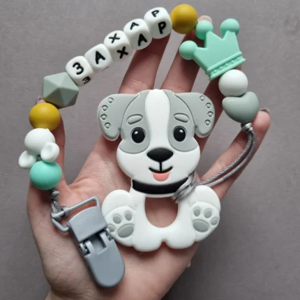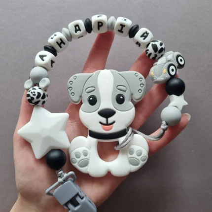 Чарівний дитячий гризунець із харчового силікону у вигляді панди— чудовий супутник для вашого малюка під час прорізування зубів. М’яка текстура силікону дбайливо масажує ясна, допомагаючи полегшити біль. Головним елементом цього гризунця є мила пандочка, яка викликає посмішку у дітей. Ви можете обрати бусини та декоративні елементи на свій смак, щоб створити унікальний аксесуар для вашого малюка. Всі деталі виготовлені з безпечного, нетоксичного матеріалу, що відповідає найвищим стандартам якості. Іменна персоналізація додає особливої індивідуальності, роблячи цей гризунець ідеальним подарунком.