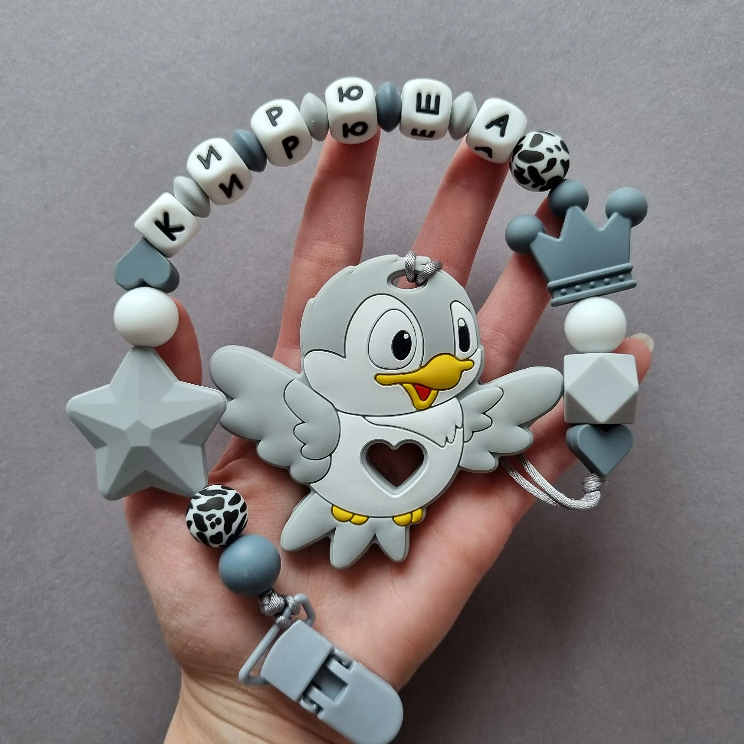 Чарівний дитячий гризунець із харчового силікону у вигляді пташки— чудовий супутник для вашого малюка під час прорізування зубів. М’яка текстура силікону дбайливо масажує ясна, допомагаючи полегшити біль. Головним елементом цього гризунця є миле пташеня, яке викликає посмішку у дітей. Ви можете обрати бусини та декоративні елементи на свій смак, щоб створити унікальний аксесуар для вашого малюка. Всі деталі виготовлені з безпечного, нетоксичного матеріалу, що відповідає найвищим стандартам якості. Іменна персоналізація додає особливої індивідуальності, роблячи цей гризунець ідеальним подарунком.