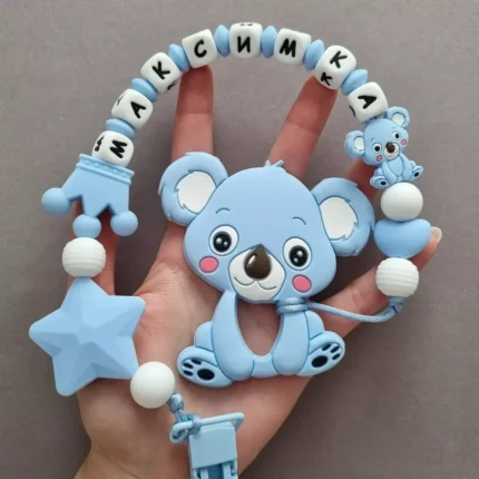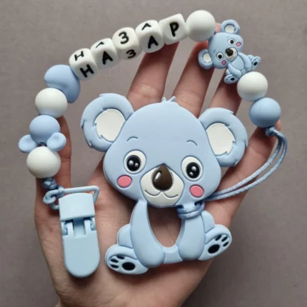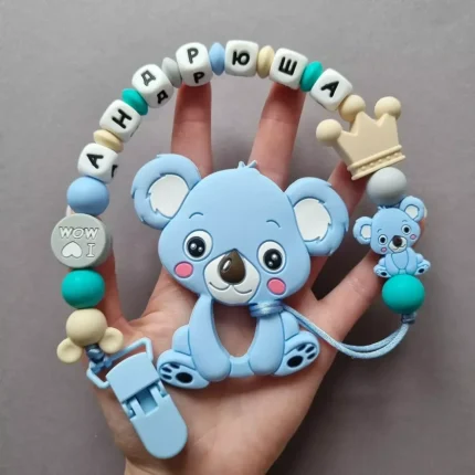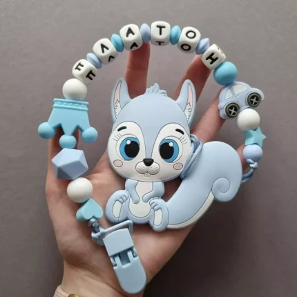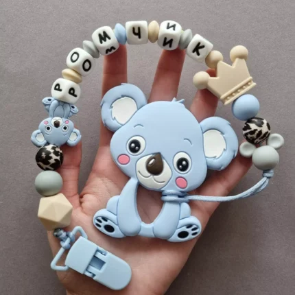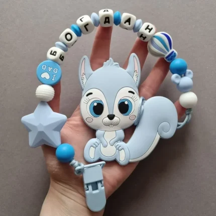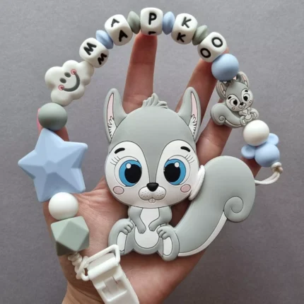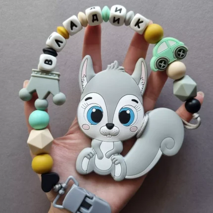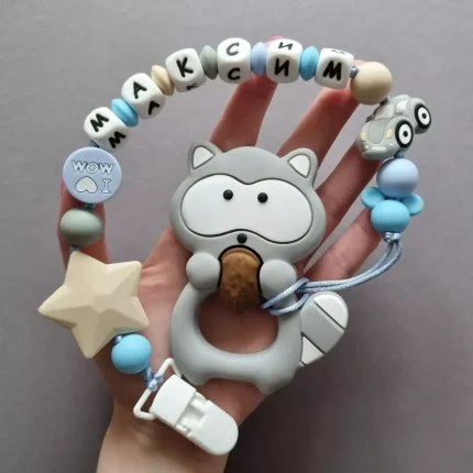 Чарівний дитячий гризунець із харчового силікону у вигляді єнота— чудовий супутник для вашого малюка під час прорізування зубів. М’яка текстура силікону дбайливо масажує ясна, допомагаючи полегшити біль. Головним елементом цього гризунця є милий єнотик, який викликає посмішку у дітей. Ви можете обрати бусини та декоративні елементи на свій смак, щоб створити унікальний аксесуар для вашого малюка. Всі деталі виготовлені з безпечного, нетоксичного матеріалу, що відповідає найвищим стандартам якості. Іменна персоналізація додає особливої індивідуальності, роблячи цей гризунець ідеальним подарунком.